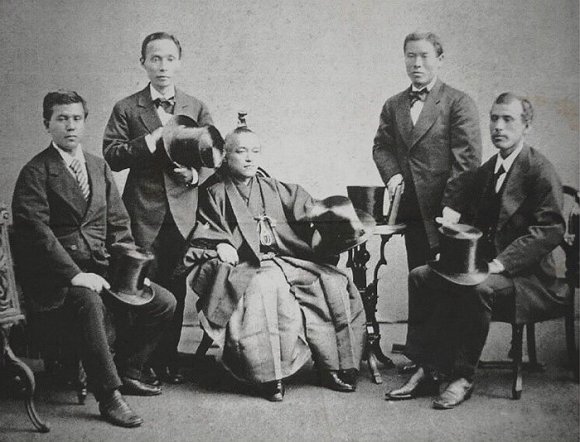 津田梅子(1864-1929)。图片来源:津田塾大学送女孩出国留学:明治维新与“岩仓使节团” 1853年7月8日,美国海军准将马修·佩里(Matthew Perry)率领四艘军舰驶入江户湾,他将美国总统米勒德·菲尔莫尔(Millard Fillmore)签署的国书递交给江户幕府,其军舰发射了几轮炮弹以示威慑。这一日后被称为“黑船来航”的事件以摧拉枯朽之势给予本就危机重重的江户幕府统治集团以沉重打击。 一股新的政治力量正在孕育。外样大名和下层武士联合起来,打出“尊王攘夷”的口号,宣布放弃对德川将军的忠诚,要求数个世纪以来没有实权隐居京都的天皇重新掌权。1868年1月,尊皇派的势力占领江户城,推倒了将军政权(此前德川家最后一代大将军德川庆喜已经请辞),宣布时年15岁的天皇睦仁复辟,明治时代就此拉开帷幕。 “明治”这一年号寓意“文明的治理”,本身就说明了新政府的施政纲领。在亲眼目睹西方国家的强大实力后,改革派政治家立誓要建立一个全新的日本,一个先进的国家。明治天皇即位时颁布了《五条誓文》,称要彻底改革日本政治、经济和社会制度,将日本发展为与西方平起平坐的国家,“破除旧来之陋习,秉持天地之公道,求知识于世界,大振皇基。” 首先要做的,就是彻底摧毁江户时代封建社会的种种残余,引入现代政治制度。1871年8月,天皇召集各藩大名领主到东京,宣布废除藩地,设置府县行政系统,由东京任命的府县官僚掌管县级事务。原大名领主的家禄和华族身份得到保留,各藩的年贡移交政府,债务也由政府承担。在这一安排下,低级别的武士——甚至是在王政复古运动中支持天皇一派的——失去了家禄、军衔及尊贵的社会地位。 1871年发生的另外一件事则彻底地改变了三位日本女孩的命运。王政复古运动的核心人物、右大臣岩仓具视计划于当年秋天率领一支由年轻政治家组成的使节团访问与日本签订过条约的所有国家,实践《五条誓文》,求知识于世界。使节团的第一站就是美国,同去的还有几十名学生,这其中也会包括女生。